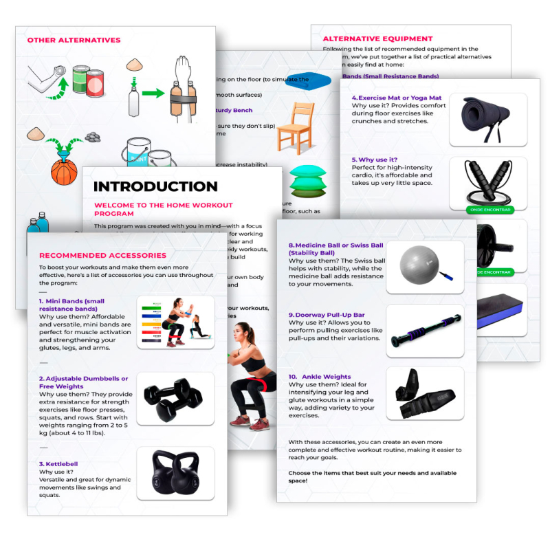 Includes a carefully curated selection of essential accessories, Stretch bands, light weights, mats, and more to turn your home into an effective fitness space, perfect for your busy day. Designed to save you time and effort, this list allows you to train with impressive results without the hassle.